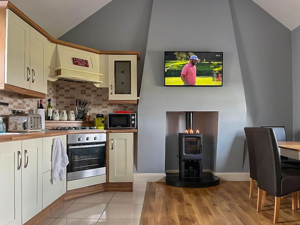 The main living area of Cosy Cottage has a solid fuel stove and features a large-screen TV wall-mounted above the stove.