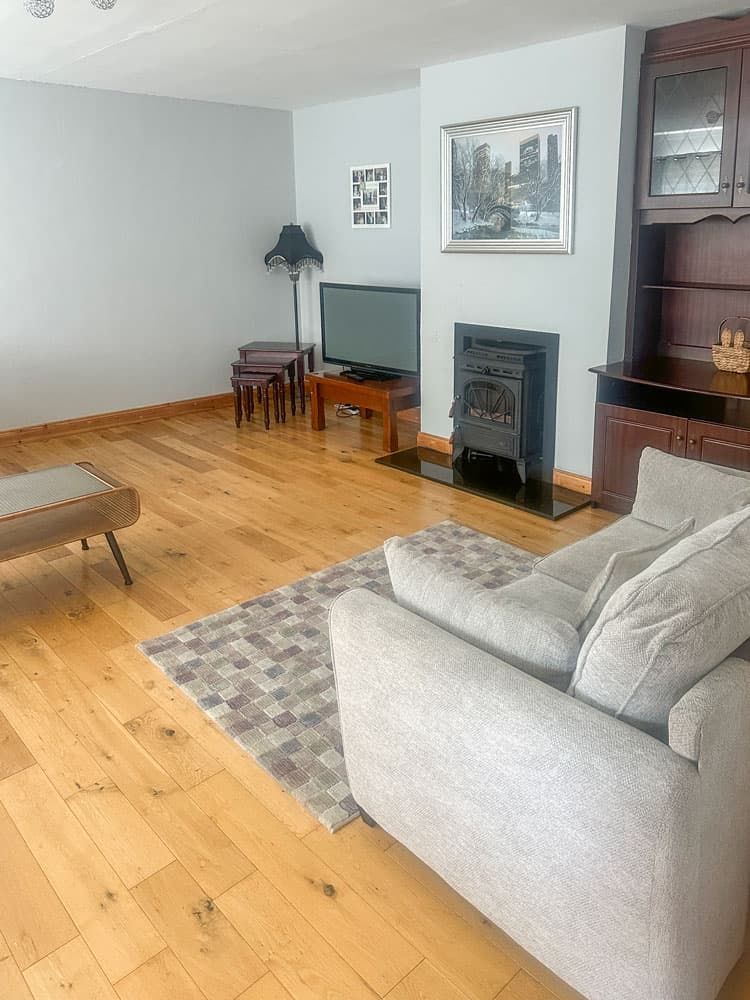 Living room with large-screen TV (wifi available) and solid-fuel stove.