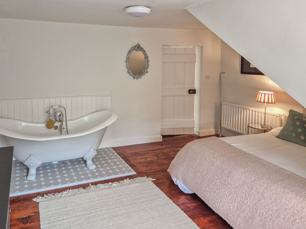 Open-plan kitchen, dining, and living area with a wood-burning stove and range cooker, a small bathroom and access to a private courtyard.