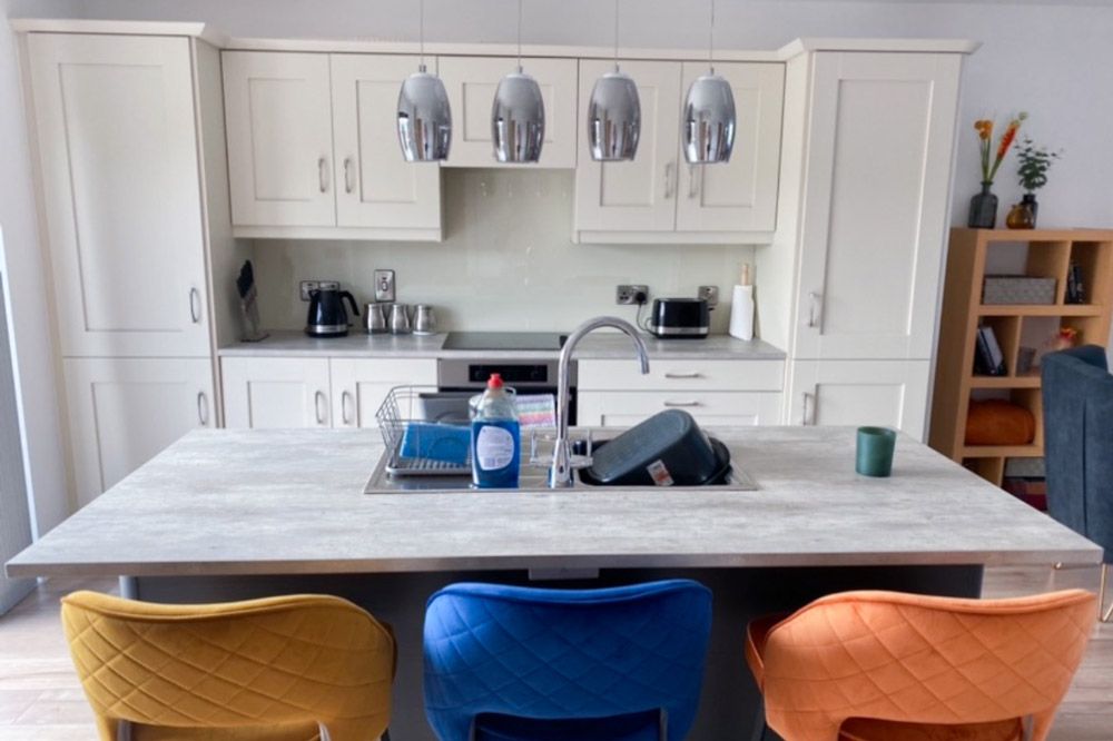 Open plan living/kitchen area with comfortable furniture and LG Smart TV