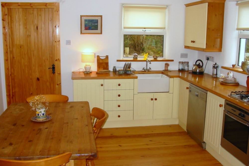 The clickable photo shows the elegant, fully fitted kitchen of Cashel Lodge. Being to the front of the house the kitchen enjoys panoramic views over Glen Lough and the hills of Donegal. Although fitted with modern appliances, the kitchen with its Belfast sink and painted furniture, has the feel of a country home.
