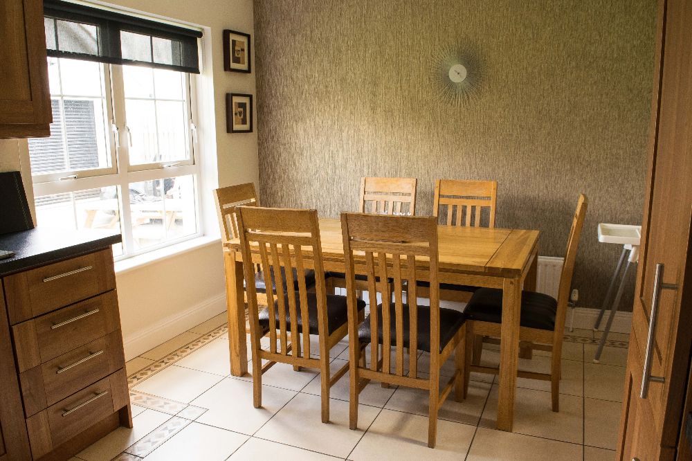 This self catering property has a modern fitted kitchen with a tiled floor. Appliances available include an electric oven with ceramic hobs, microwave and fridge freezer. An adjacent dining area has a table and 6 stylish dining chairs, together with a babies high chair.