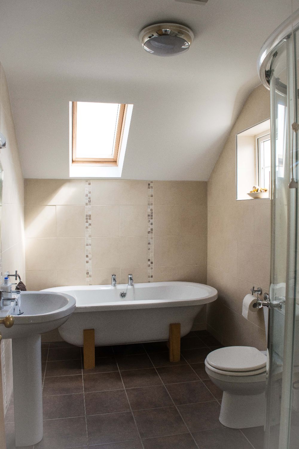 There is a first floor bathroom with a roman bath and a seperate electric shower