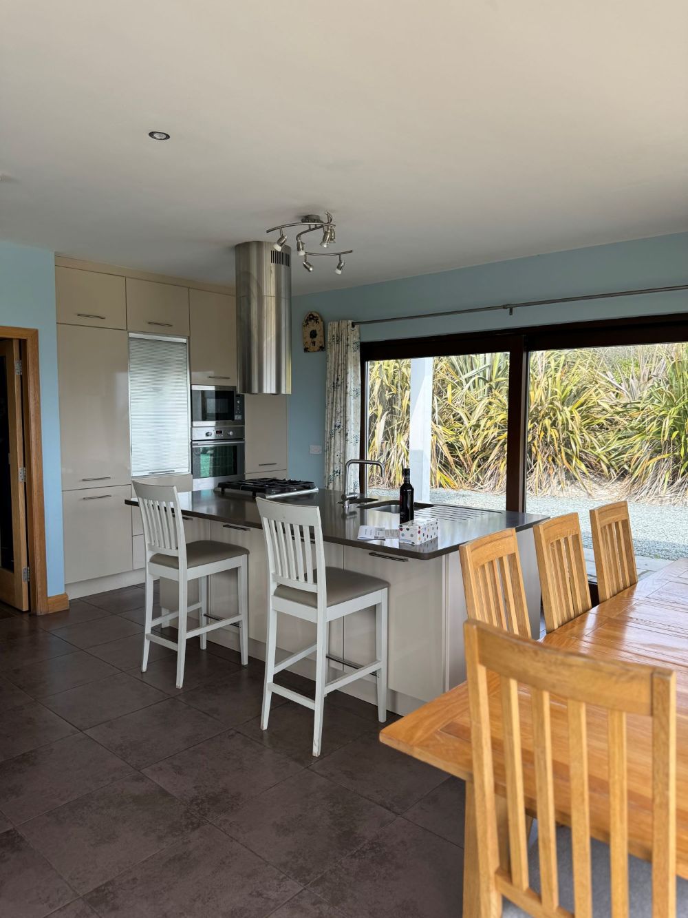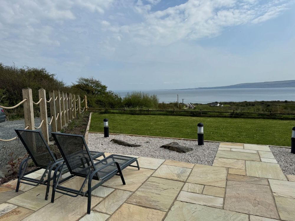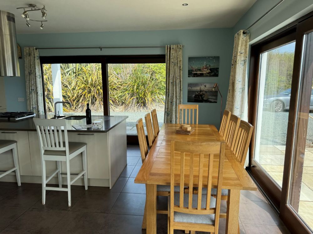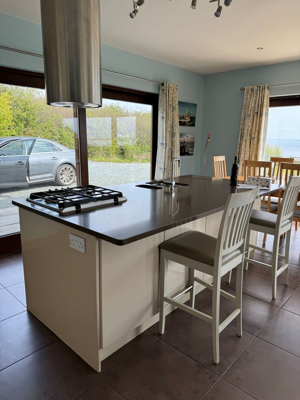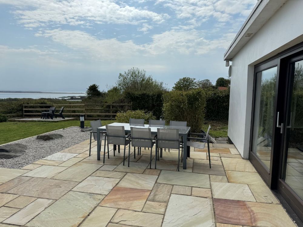 This lovely contemporary holiday home is in a secluded location set well back from the road protected by a large rock outcrop that ensures privacy. It has superb sea views and a large deck area and separate patio area. There is one large open plan living area with windows/doors to three sides giving lovely sea and countryside views. The house is fully equipped with all new furniture and fixtures and fittings.