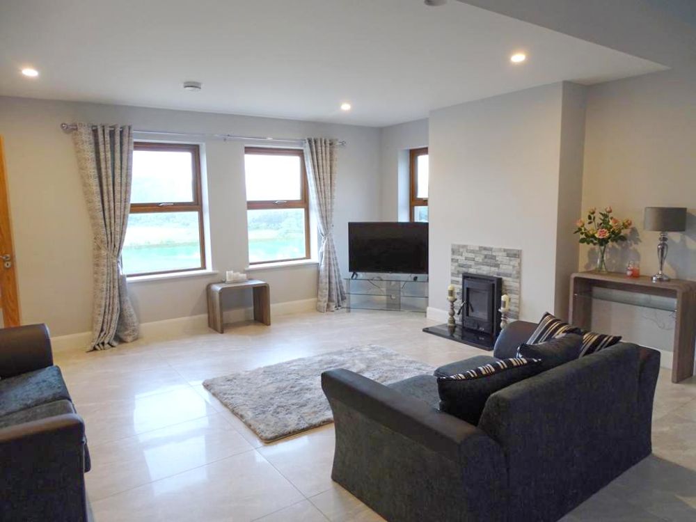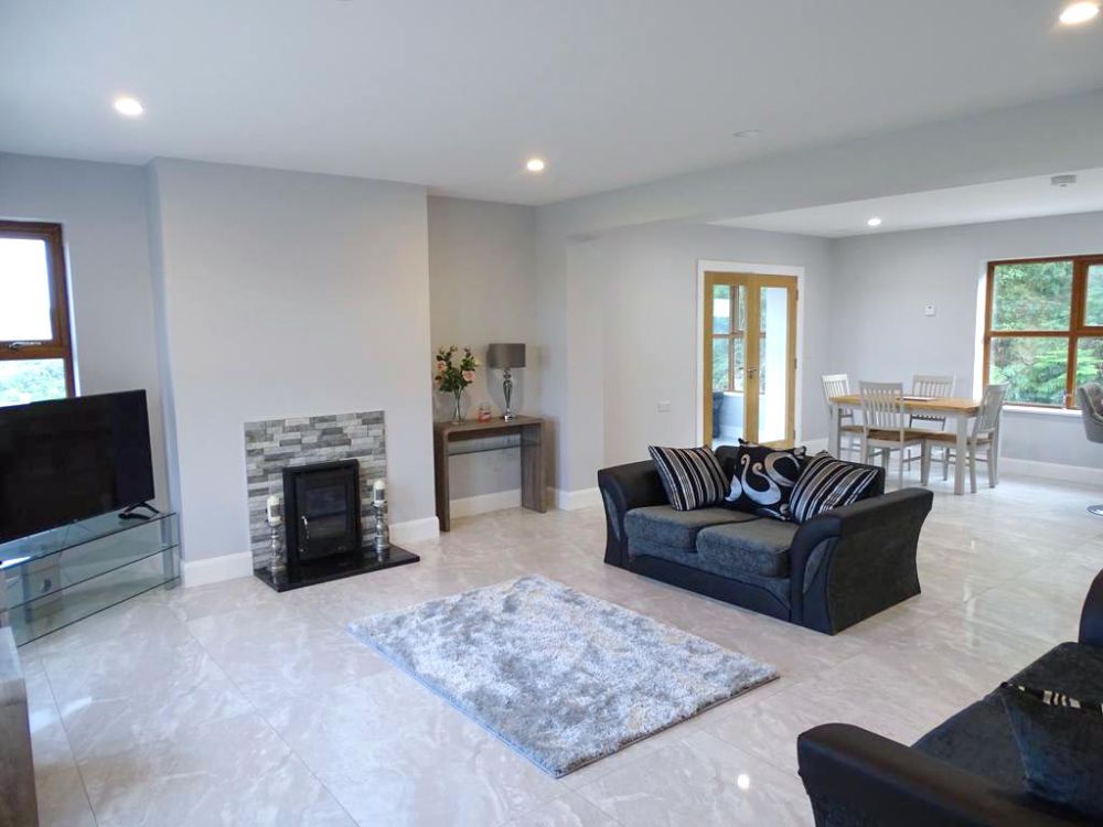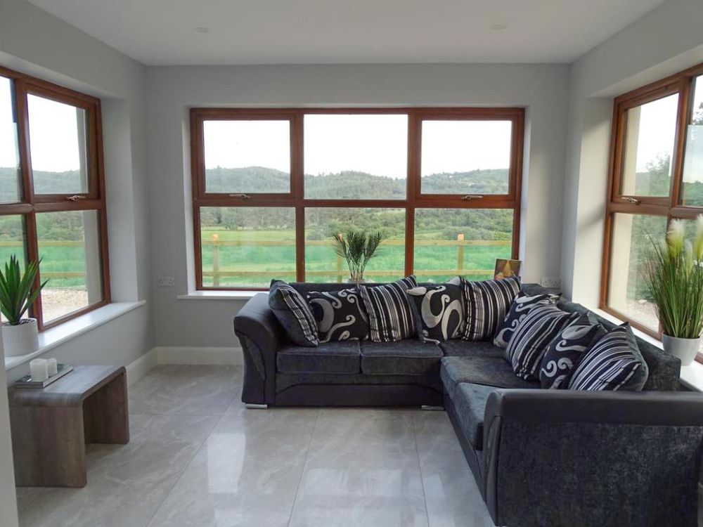 The living area features a smart TV and panoramic views over the forest towrds the church at Ballymore
