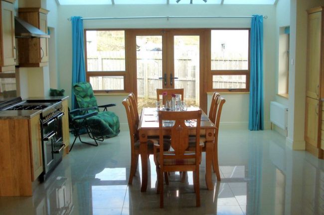 The holiday home has a bright and spacious open plan ground floor. The kitchen and dining area has a tiled floor. Appliances available in the kitchen include an electric cooker with gas hobs, microwave, dishwasher, and fridge with ice-box. The dining area has an elegant table and 6 chairs.