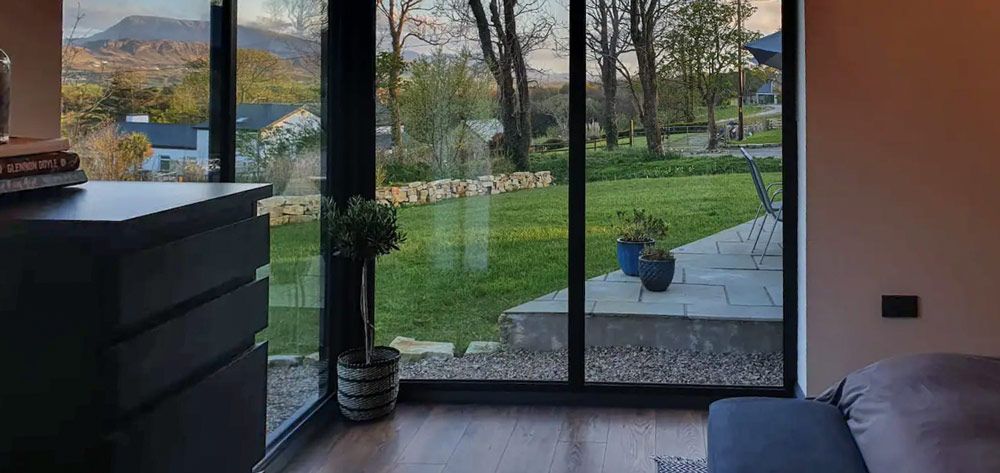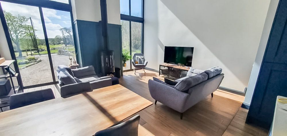 The living room comes with large two-story windows offering beautiful views of Muckish Mountain and the sea at the bottom of our private road.