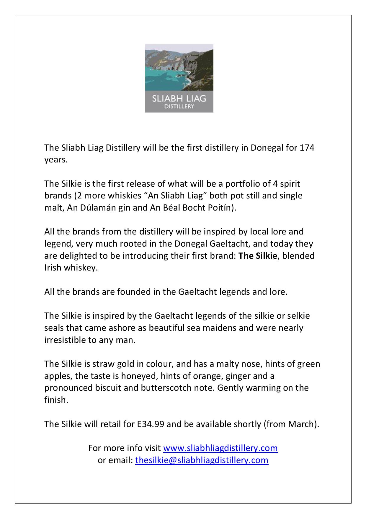 The Sliabh Liag Distillery will be the first distillery in Donegal for 174 years and their first whiskey is The Silkie – named after the legendary shape-shifting, sea-maidens with long dark hair, deep soulful brown eyes and enchanting voices that were nearly irresistible to any man.