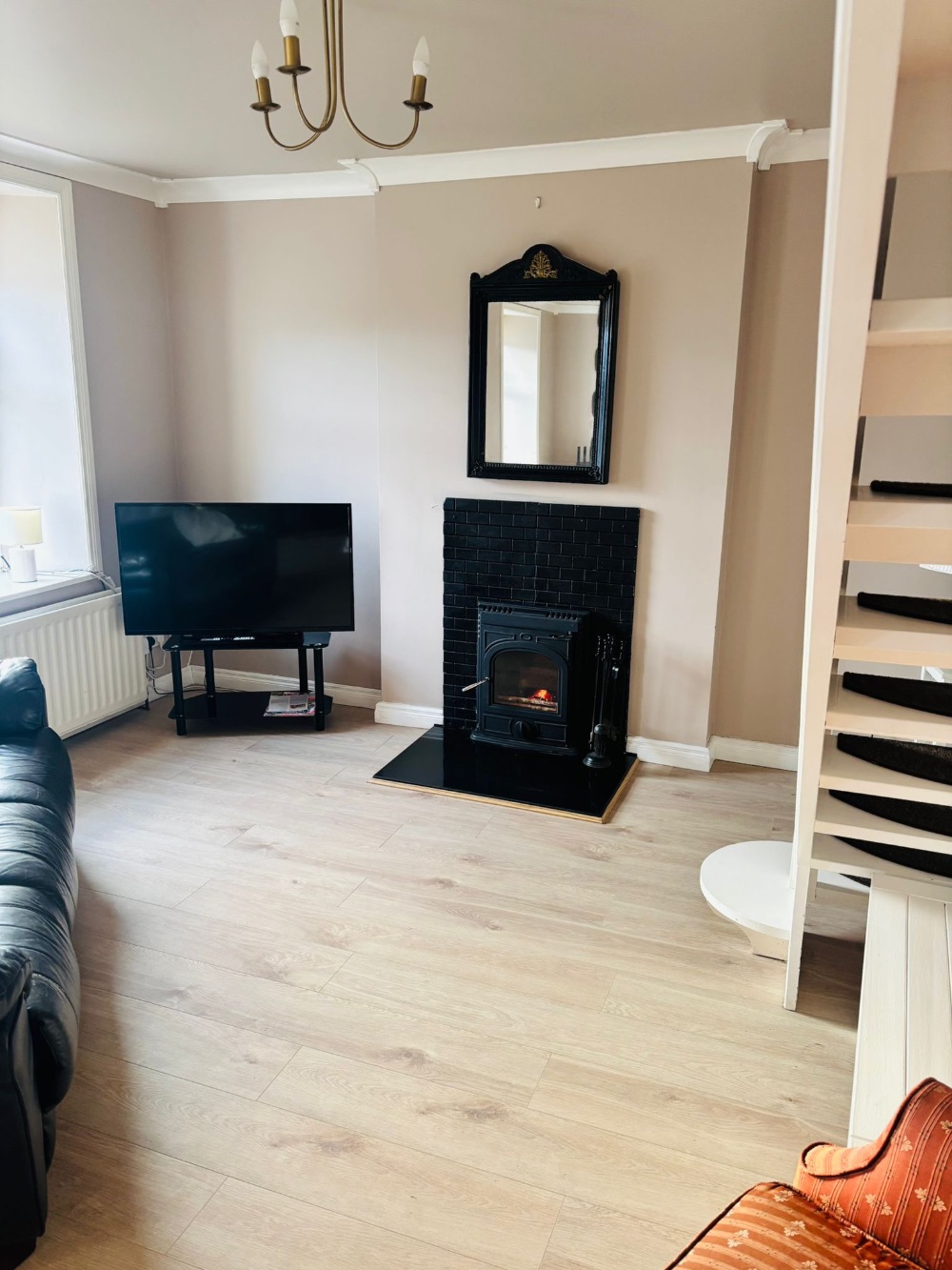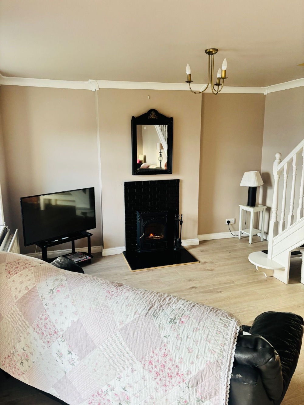 The focal point of the living area is a lovely open fireplace with an over mantle mirror. The area has a comfortable sofa and for home entertainment there is a 46" Smart tv.