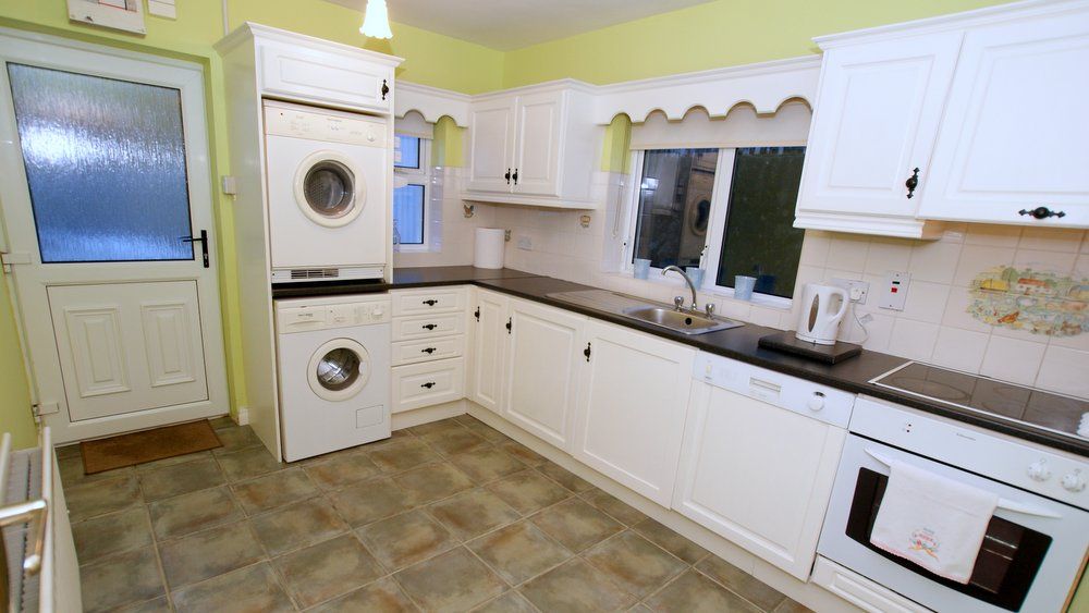 The holiday home has a bright and airy kitchen with tiled floor. Appliances available include electric oven and hobs, microwave, dishwasher and fridgefreezer. A washing machine and tumble dryer are also available. There is an ample supply of cutlery and crockery.