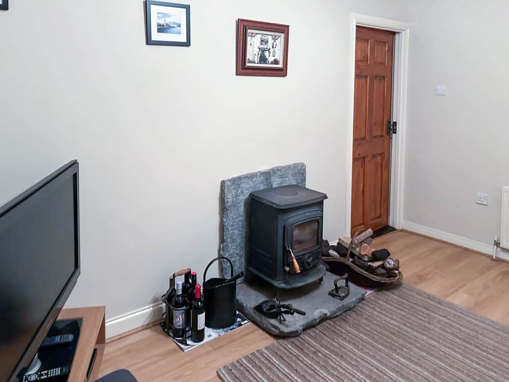 The living room is equipped with TV/DVD and features a solid-fuel stove.