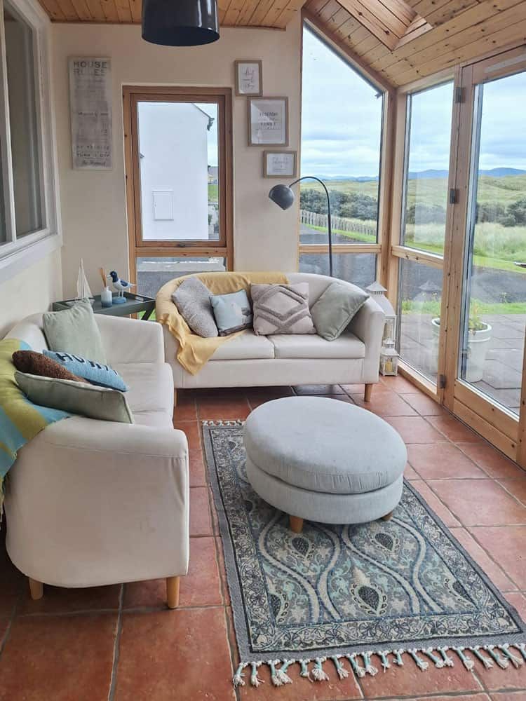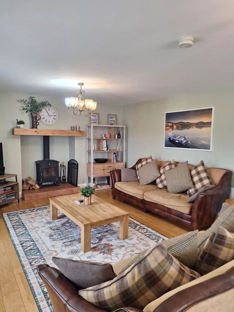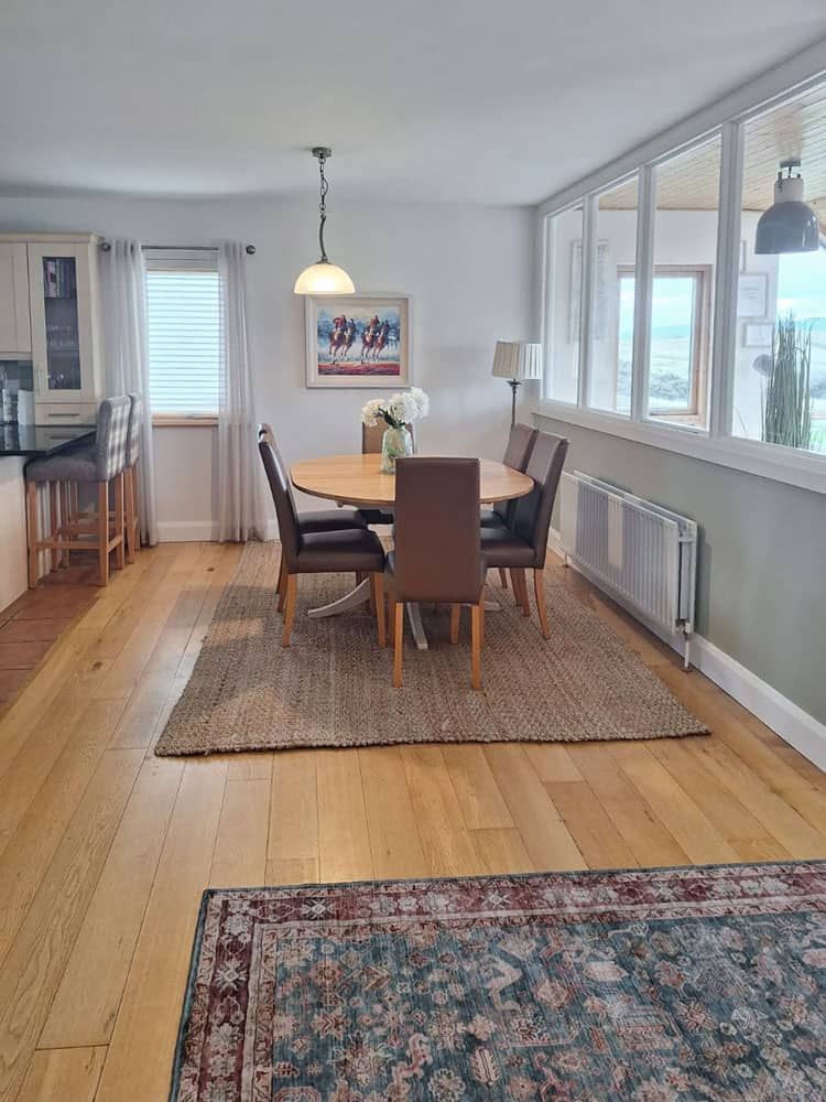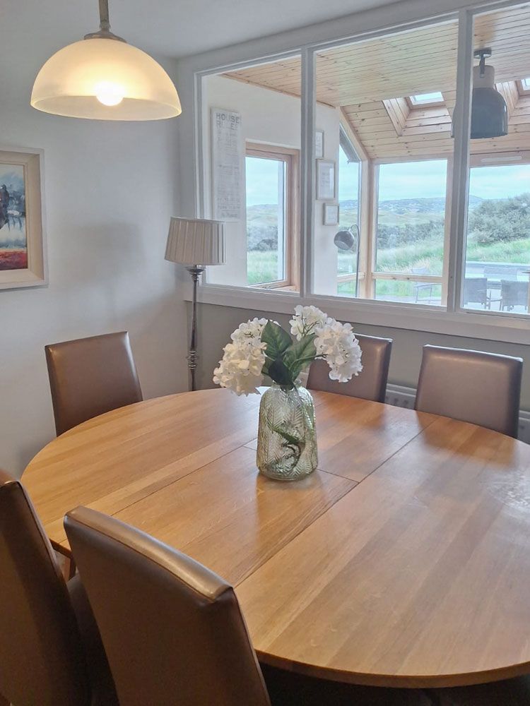 A large open plan living area with amazing views of Rosapenna Golf Course with a wood burning stove, dvd library, childrens and adults books, board games, dvd player and satellite TV. 300 Megabit Fibre WiFi ensures fast connectivity to the outside world (if needed!).