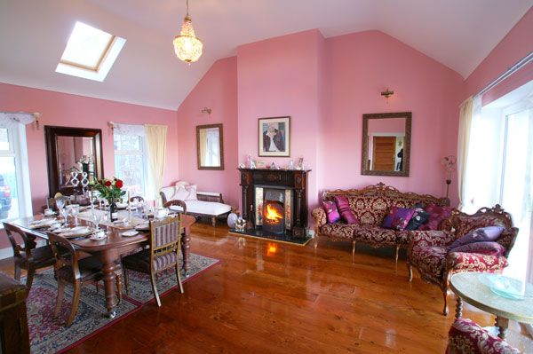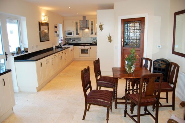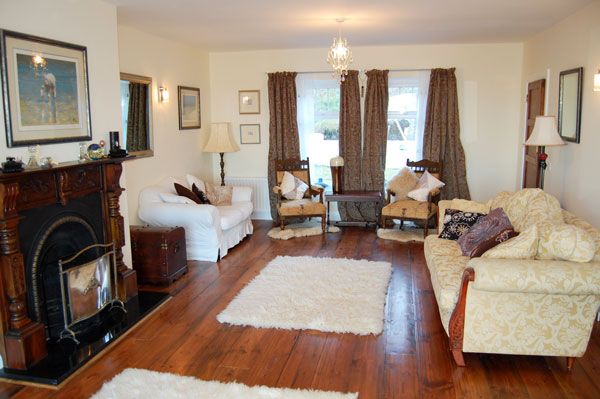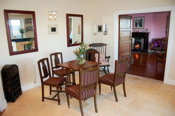 The large living and dining room with its open fireplace and high ceiling enjoys wonderful views of the North Donegal coastline. The furniture is antique, comfortable and luxurious. The dining table can accommodate up to 10 people.