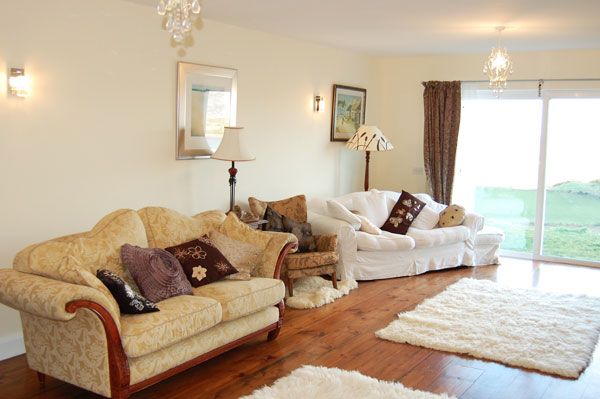 An attractive feature of this deluxe holiday home is the existence of two separate living / reception rooms. The photograph above shows the traditional style living room on the ground floor. This bright living space has an open fireplace, luxury furniture suite and a hardwood floor. For home entertainment there is a flat screen tv and dvd. This room enjoys wonderful views of the North Donegal coastline near Tory Island