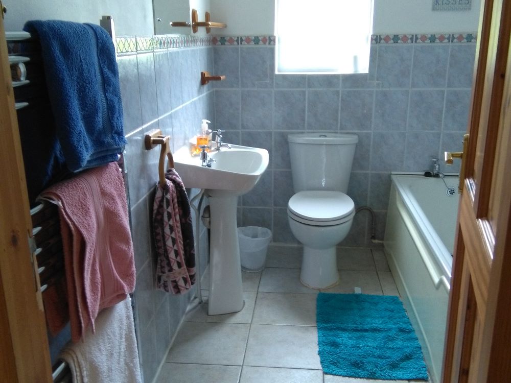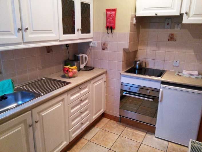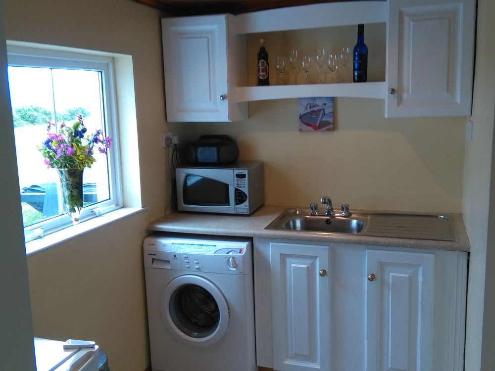 The kitchen has a tiled floor and has the following appliances available - electric cooker, oven, microwave, toaster, radio, fridge and a freezer. There is also a washing machine, an ironing board, an electric iron and an outside clothes line provided.