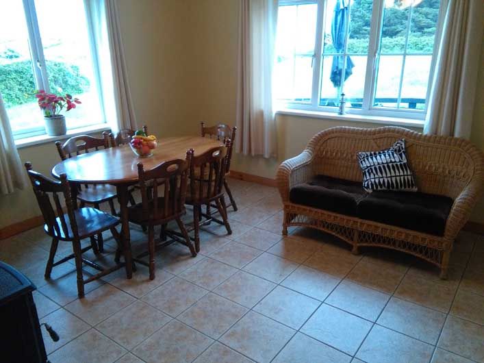 The tiled dining room has a modern solid fuel stove and has wicker armchairs. It features a dining table with 6 chairs and has sea views.