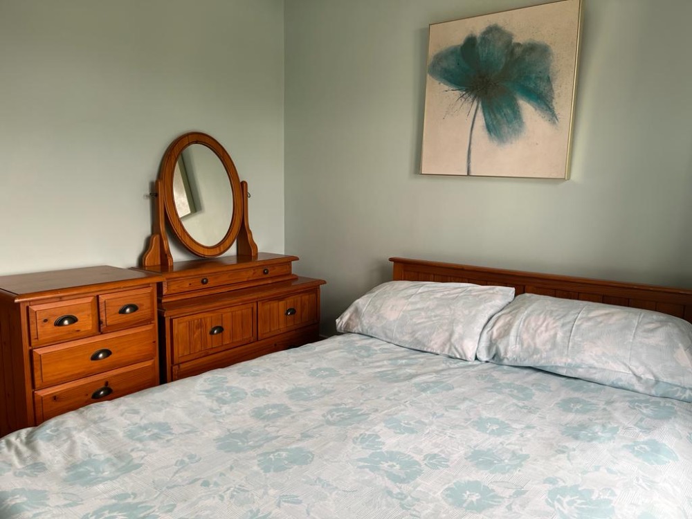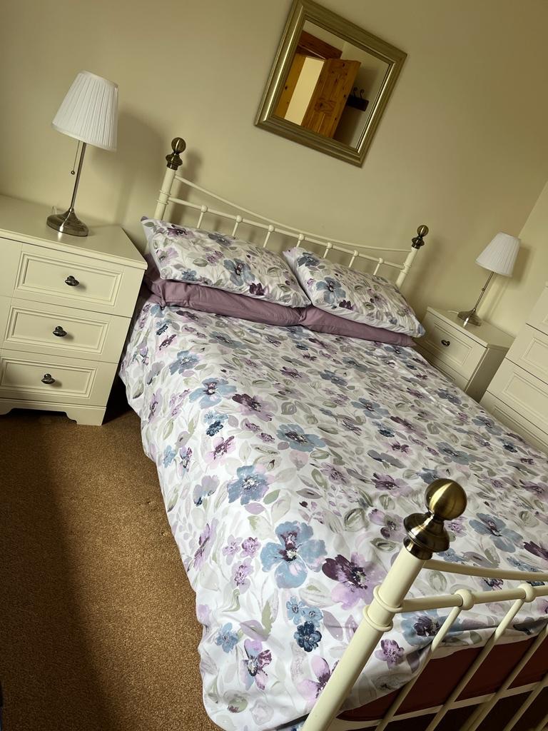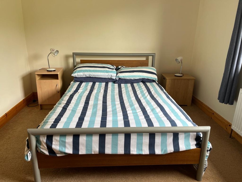 The holiday home has a comfortably furnished living room with an open fireplace - turf supplied. The room enjoys views over Dunfanaghy. For home entertainment there is a large flatscreen tv with Sky Q. There is also a dvd player and a selection of dvds