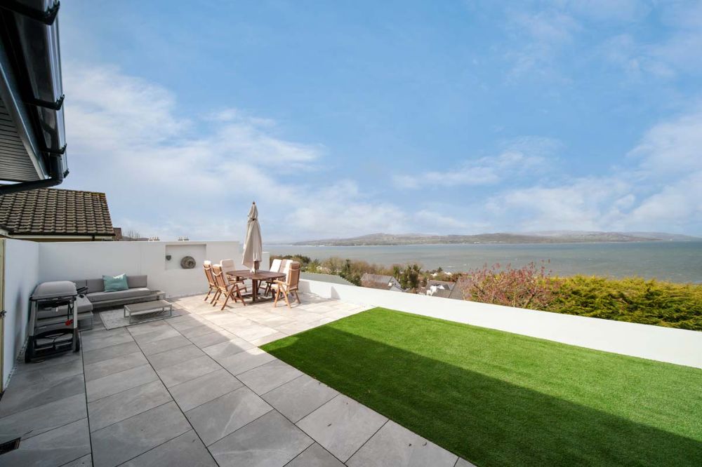The large patio located to the front of the house facing the sea views offers incredible panoramic views of Lough Swilly, Inch Island, Rathmullan, and Buncrana. Simply stunning sunset views direct from the patio. Sloped garden to the front which is on a hill and a hilled garden to the rear of the property.