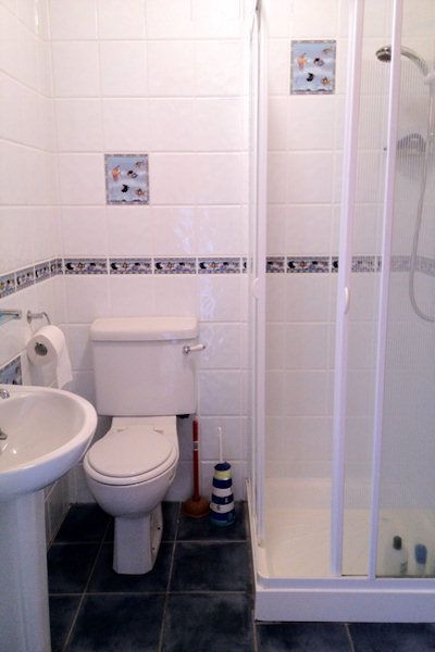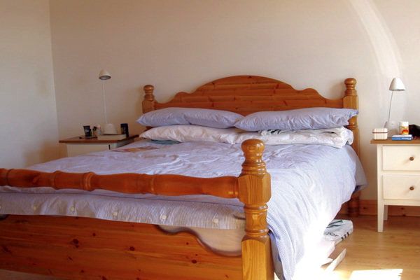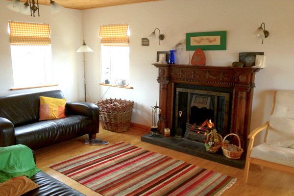 The holiday home sleeps up to six people. There are three bedrooms - one downstairs with double bed, and two upstairs with twin beds. The ground floor is open plan in design. The living area has comfortable sofas and an open fireplace (turf supplied). There is a fully equipped modern kitchen with adjacent dining area. There are views of the sea to the front of the house.