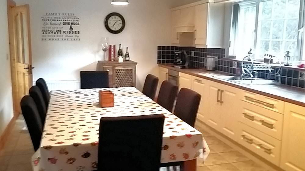 The holiday home has a large fully fitted, modern kitchen with a full range of cooking and cleaning equipment. Appliances available include electric oven with halogen hobs, microwave, 4 stack toaster, large fridge/freezer, sandwich toaster, fresh coffee maker and dishwasher.