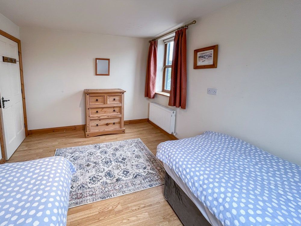 The holiday home has a large L shaped main room with living and dining areas. There is a comfortable leatherette suite, a rocking chair and an additional sofa and occasional chairs. The living space features a large wood/turf burning stove and flatscreen tv with dvd player. A selection of board games, books and dvds is available. The room looks out on a rural setting with distant sea views.