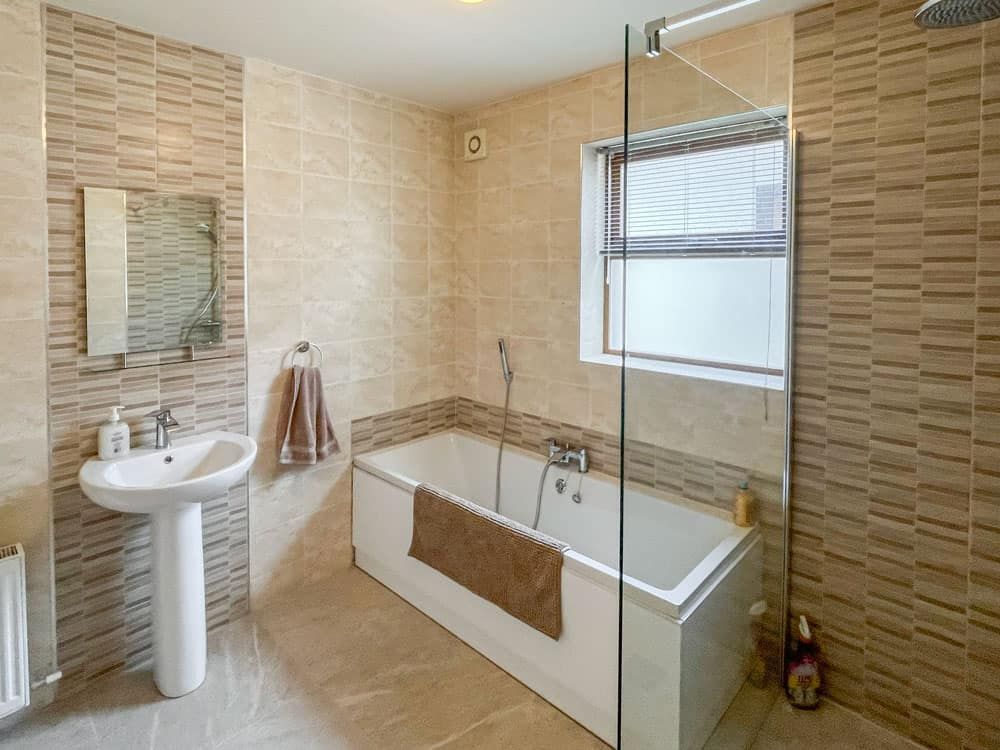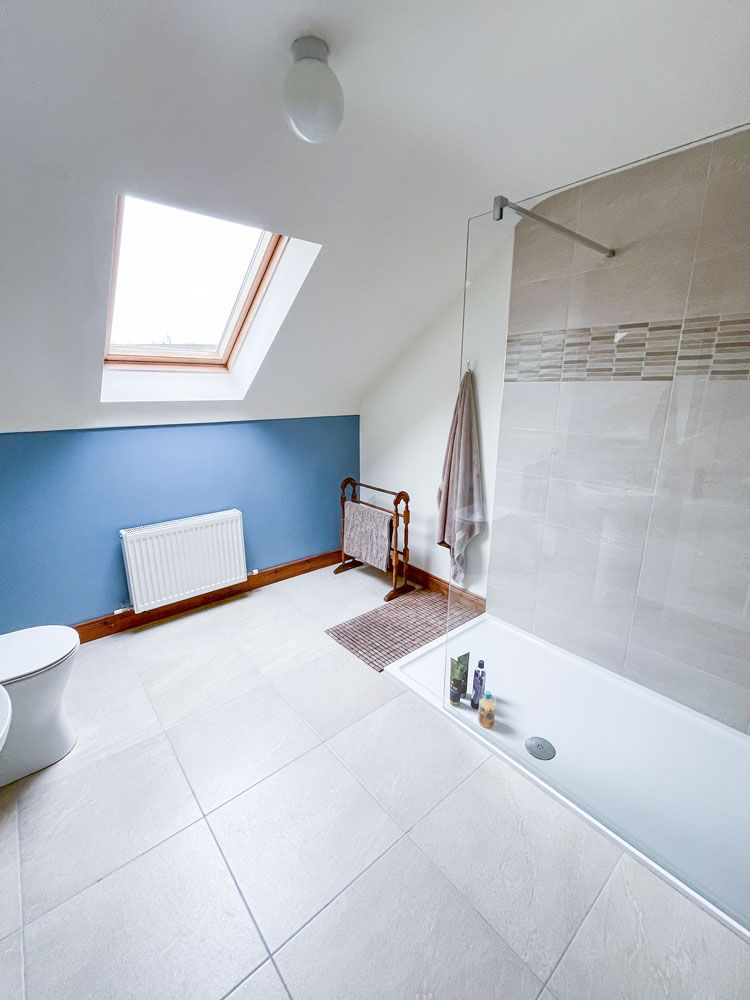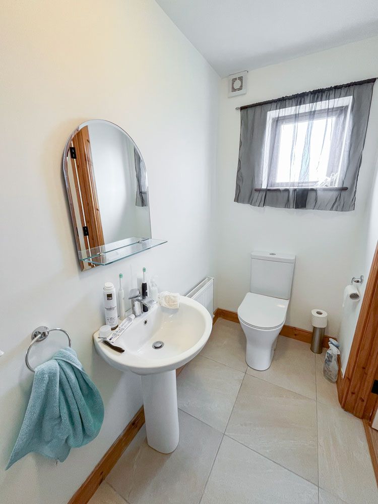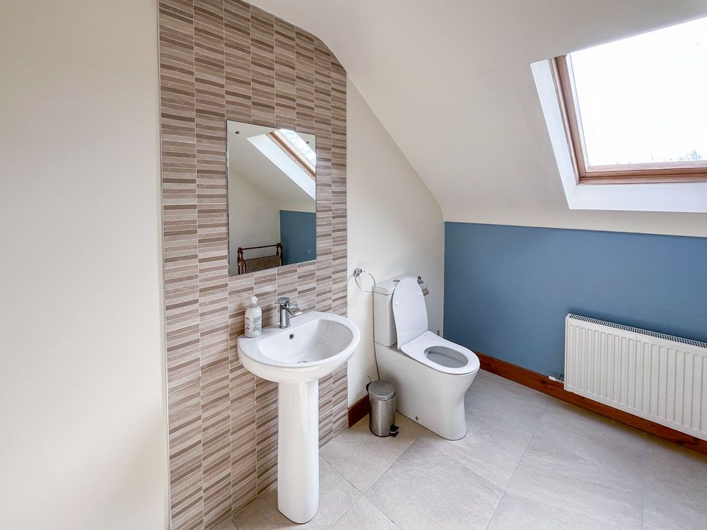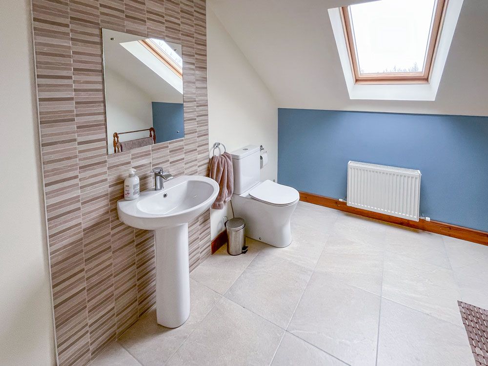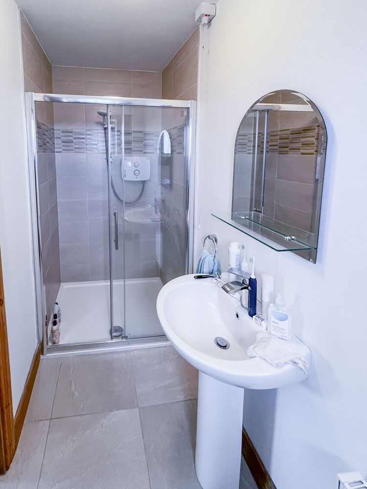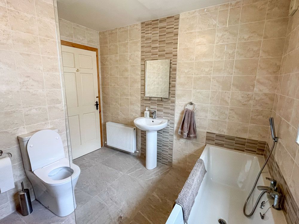 There is a downstairs bathroom with sink, toilet and whirlpool bath and shower attachment. On the first floor there is a shower room with sink and toilet with hot water from tank.